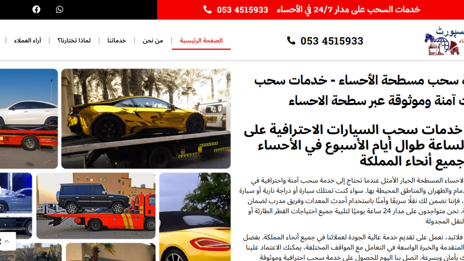 SathaAlHasa.com is a car towing and roadside recovery service based in Al Ahsa, Saudi Arabia. The business provides 24/7 emergency towing with a focus on fast, reliable service and instant communication through WhatsApp.