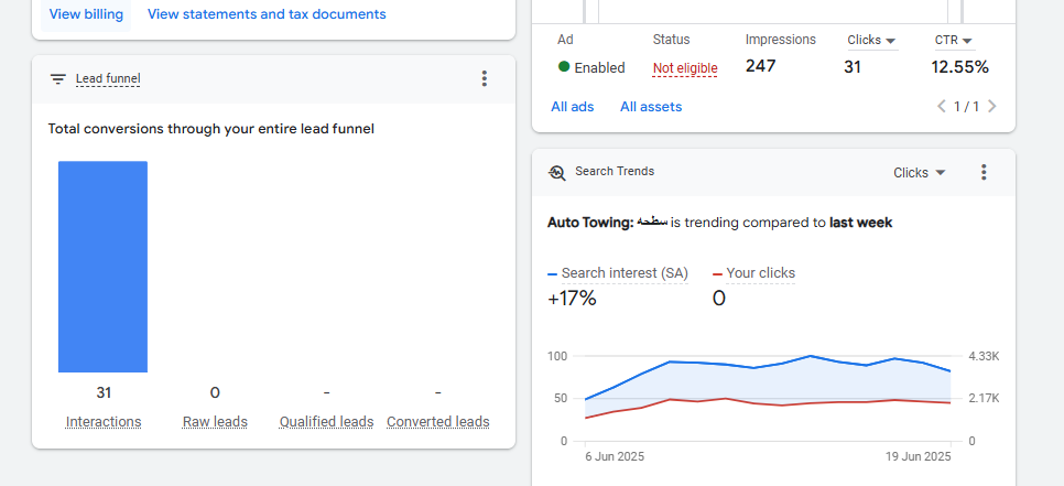 To generate immediate leads in a highly competitive local market, we launched a one-day Google Ads campaign targeting urgent towing needs in Al Ahsa.